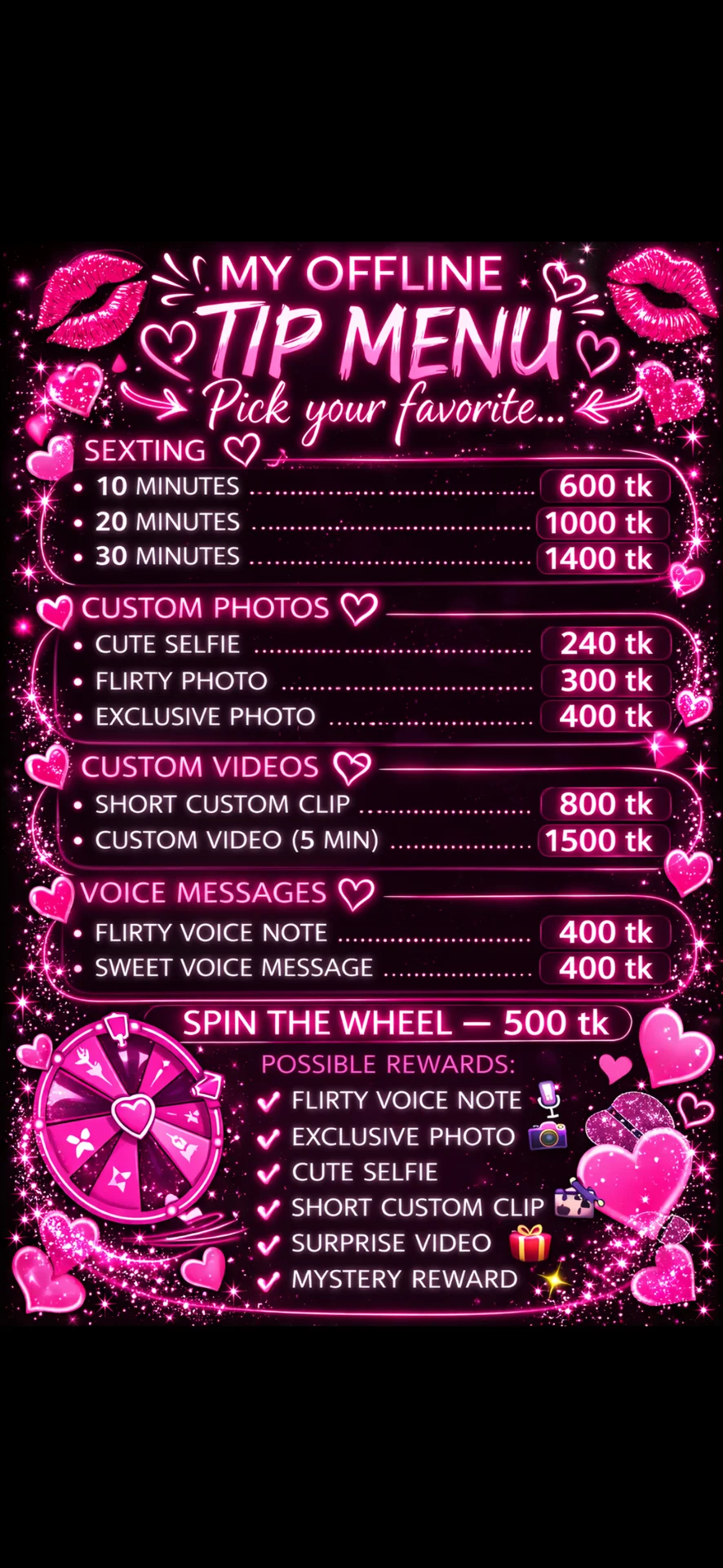 Ahegao, Blowjob, Berkedip, Cosplay, Tenggorokan, Dildo atau Vibrator, Tarian Erotis, Meraba, Fetish Kaki, Heels, Korset, Tingkat Penis, Lateks, Kulit, Memasak, Facesitting, Handjob, Tersedak, Nilon, Pertunjukan Minyak, Masturbasi, Orgasme, Bermain Peran, Instruksi Masturbasi, Dirty Talk, Striptis, Topless, Yoga, Mainan Anal, Anal, Mainan Puting, Tittyfuck, Cowgirl, Krim, Doggy Style, Mandi, Hardcore, Pantat ke Mulut, Mainan Seks, Memukul, Twerk, Rok atas